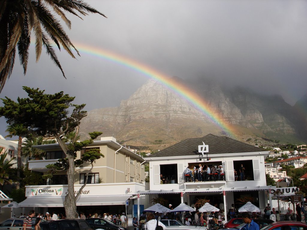 Letzten Sonntag (17.02.2006) waren wir nach einem fruehen Abendessen in der Stadt noch auf einen Sundowner in Camps Bay. Dort gab es einen wunderschoenen Regenbogen, den wir Euch nicht vorenthalten moechten. Er ist auf dem Foto nur halb so intensiv wie er in Wirklichkeit war, aber immerhin finde ich, dass das Foto ganz nett geworden ist.