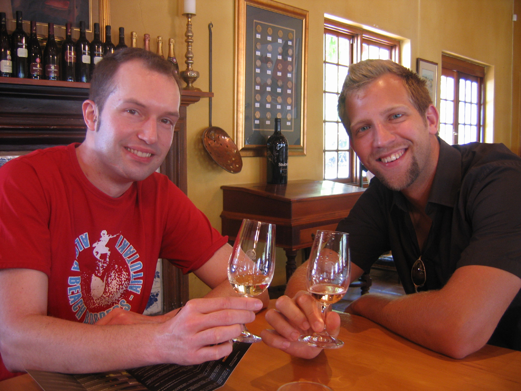 Danach ging es auf eine kleine Winetour. Der erste Halt war Simonsig. Das Weingut hat einen hervorragenden Cape Classique. Ein Cape Classique wird genauso hergestellt, wie ein Champagner, darf sich nur nicht so nennen, weil er ja vom Kap und nicht aus der Chamgagne kommt. Anschließend fuhren wir nach Stellenbosch. Dort war allerdings eine Veranstaltung, so dass wir ein wenig im Stau standen. In Stellenbosch haben wir uns ein paar Läden angeschaut und einen Kaffee getrunken. Auf dem Rückweg haben wir noch bei dem ganz kleinem Weingut Louisenhof Halt gemacht. Dort hat Lars mittags um drei einen Brandy probieren, was ein wenig zu früh für ihn war.Abends haben wir dann Kapstadt unsicher gemacht ;-) Zuerst ging es mit Matthias, Katarina, Anthony und Colin in ein Restaurant, das von Außen ziemlich unscheinbar und etwas komisch aussah. Das Essen und die Atmosphäre waren allerdings ausgezeichnet.